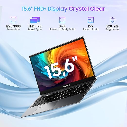 - 💻[15.6” Brilliant Visual Experience] Immerse yourself in stunning visuals with the 1920x1080 FHD IPS (16:9) display on the Blackview laptop. Enjoy vibrant colors and sharp details, and experience a wider, more captivating view on the 15.6" narrow bezel notebook computer screen. Built-in 1MP front camera centered above the screen frame, take pictures or make video calls at any time.