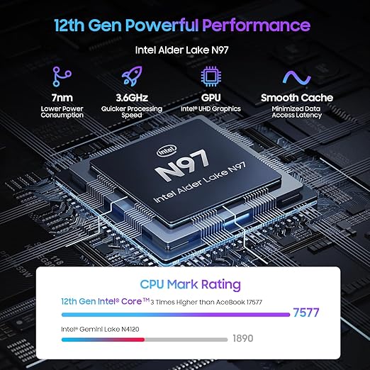 - 🏆[12th N97 CPU (Up to 3.6GHz)] Blackview laptop Computer Equipped with fingerprint recognition hardware, fingerprint unlocking can be easily achieved. Powered by an 12th generation Intel N97 processor with 4 cores and 4 threads, this laptop ensures seamless operations at speeds of up to 3.6 GHz, featuring 7 nm for smoother and smoother system operation, and a 70% increase in overall performance over its predecessor, with the latest operating system easy to realize your multi-tasking.